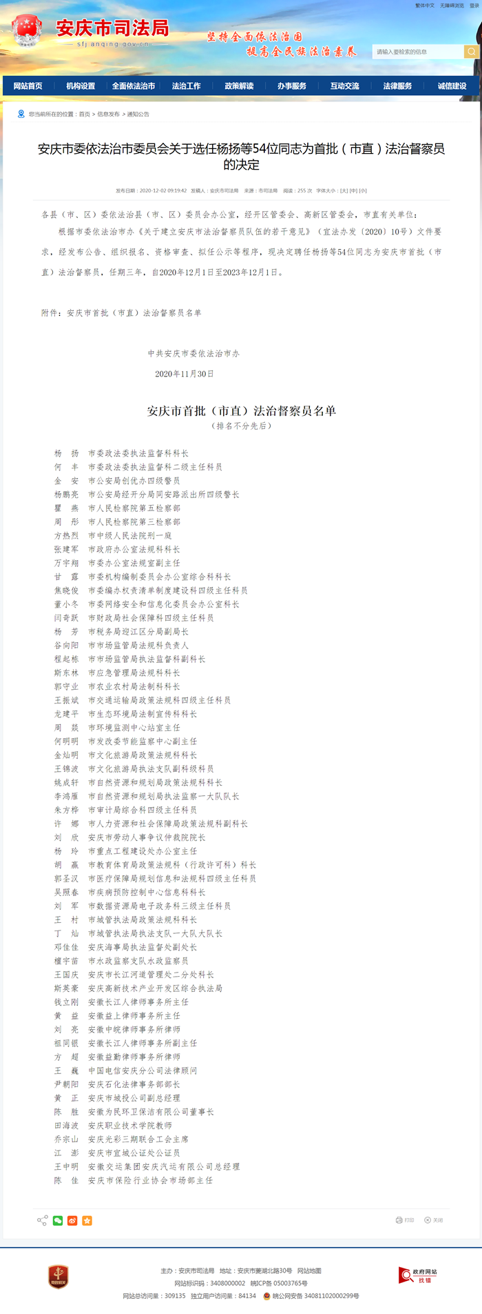 從市委依法治市辦公室獲悉,經(jīng)發(fā)布公告、組織報名、資格審查、擬任公示等程序,市委全面依法治市委員會聘任我司總經(jīng)理王中明等54人為安慶市首批(市直)法治督察員,任期三年,自今年12月1日至2023年12月1日。這標志著安慶市法治督察員隊伍正式組建。