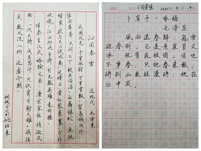 童安校車(chē)開(kāi)展“翰香獻(xiàn)禮,感念黨恩”紅色詩(shī)詞書(shū)寫(xiě)活動(dòng)。通過(guò)書(shū)寫(xiě)《卜算子·詠梅》《沁園春·雪》《七律·長(zhǎng)征》等經(jīng)典紅色詩(shī)詞,傳承紅色基因,發(fā)揚(yáng)紅色精神。