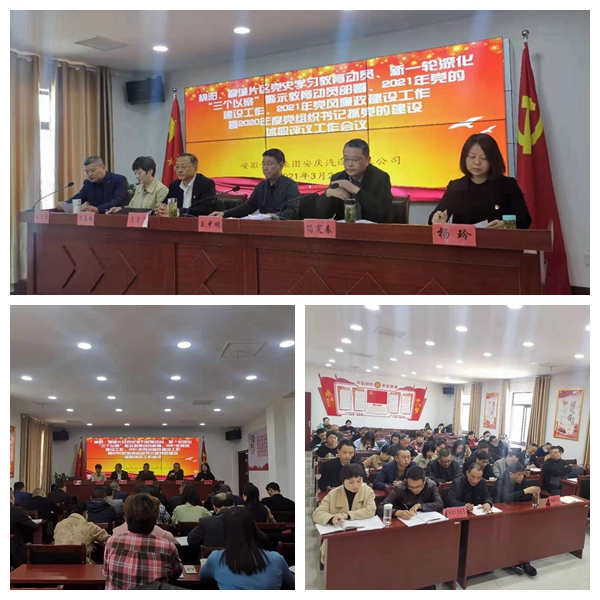 2021年3月23日下午,公司在望江分公司合并召開望江和懷寧兩片區(qū)四個(gè)單位領(lǐng)導(dǎo)班子成員及黨員代表參加的黨史學(xué)習(xí)教育動(dòng)員、新一輪深化“三個(gè)以案”警示教育部署、2021年黨的建設(shè)工作、2021年黨風(fēng)廉政建設(shè)工作暨2020年度黨組織書記抓黨的建設(shè)述職評(píng)議工作會(huì)議。公司領(lǐng)導(dǎo)王中明、馮定春、余雙友出席了會(huì)議。