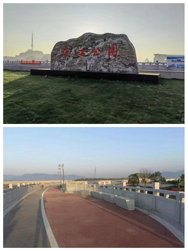 昔日因防洪墻改造而搬遷的公司舊址已變成濱江公園,現(xiàn)已成為小城一道亮麗的風(fēng)景!盀I江公園”四個紅色的大字,蒼勁有力,深深印在有底座的巨石之上,在小城的晨光里熠熠生輝,象征小城百折不撓精神的靈璧石,似牛似象,撫慰心靈。各種名貴的樹木、景觀石、兒童游樂場鑲嵌其中,各種健身器材呈圓形分布開,健身過后還可登上防洪墻,寬大的墻體頂部由紅、黑兩色鋪成的瀝青路面,可滿足不同游客的需求(慢跑和競走),百十米就有石凳靜候、亭臺守望。如果沒有波光粼粼的長河相伴,你會以為在步履“長城”。